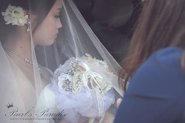看看~我的捧花很完美地把頭紗頂出一個讓臉可以好好喘息的空間~